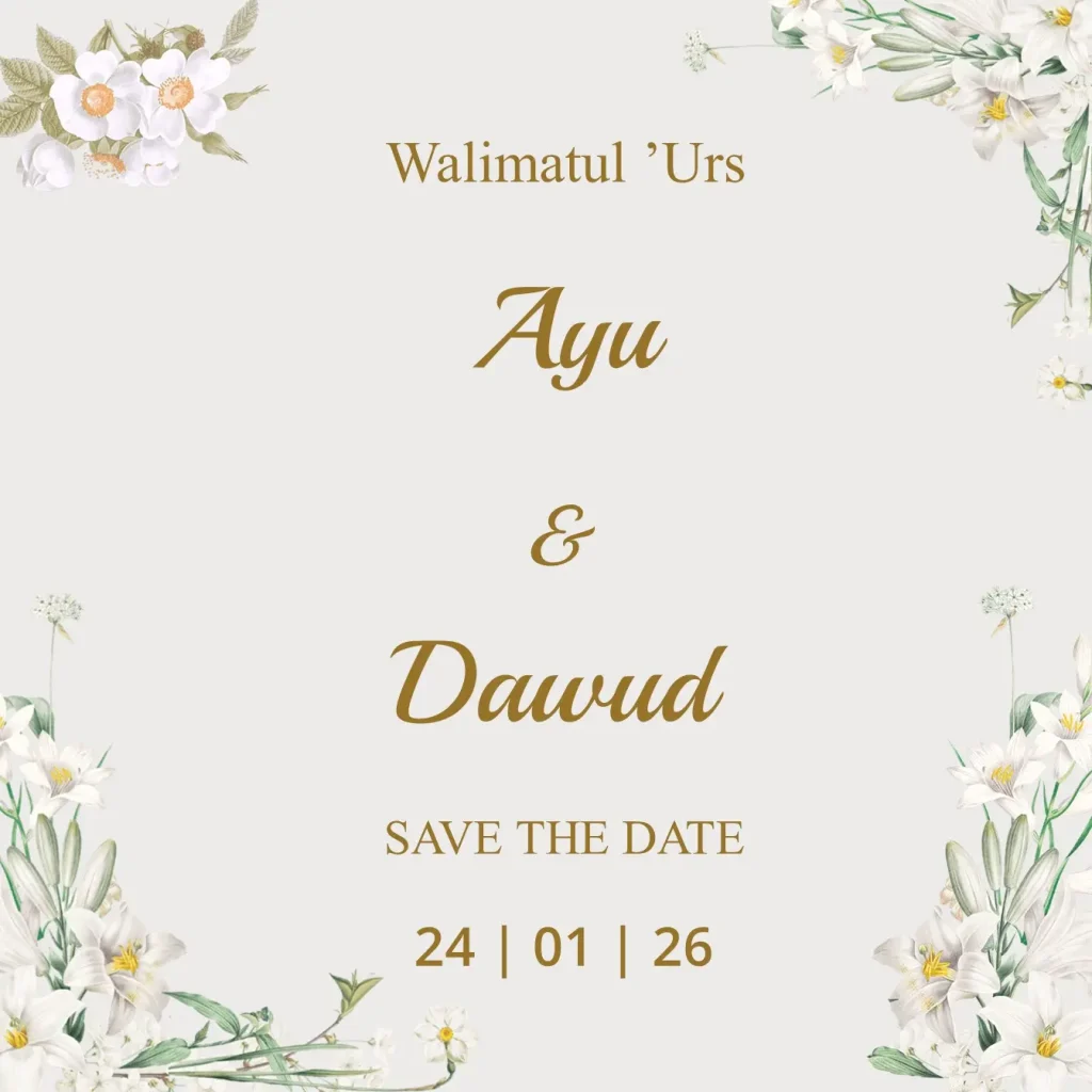 Save The Date Ayu & Dawud kepada Buka Undangan Ayu & Dawud Simpan di Kalender Assalamu’alaikum Warahmatullahi Wabarakatuh Segala Puji Bagi Allah ta’ala yang telah menjadikan hambanya hidup berpasang-pasangan. Dengan memohon Ridho, Rahmat, dan Berkah Allah ta’ala, kami bermaksud untuk mengundang Saudara/i dalam acara pernikahan yang kami selenggarakan. Count Down Hari Jam Menit Detik MENIKAH Ayu Mila […]