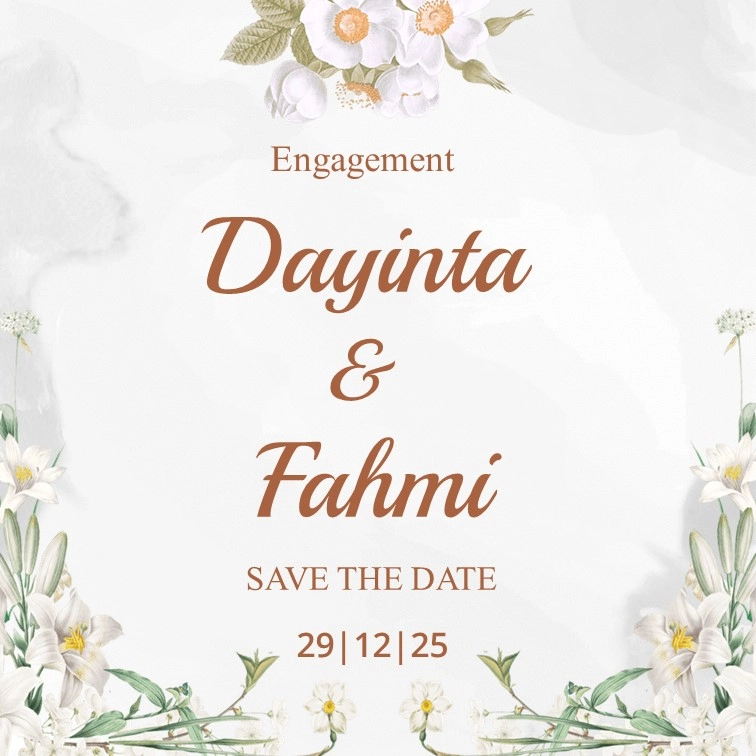 Save The Date Dayinta & Fahmi kepada Buka Undangan Dayinta & Fahmi Simpan di Kalender Assalamu’alaikum wr. wb. Segala Puji Bagi Allah SWT yang telah menjadikan hambanya hidup berpasang-pasangan. Dengan memohon Ridho, Rahmat, dan Berkah Allah SWT, kami bermaksud untuk mengundang Saudara/i dalam acara Lamaran yang kami selenggarakan. Count Down Hari Jam Menit Detik LAMARAN […]
