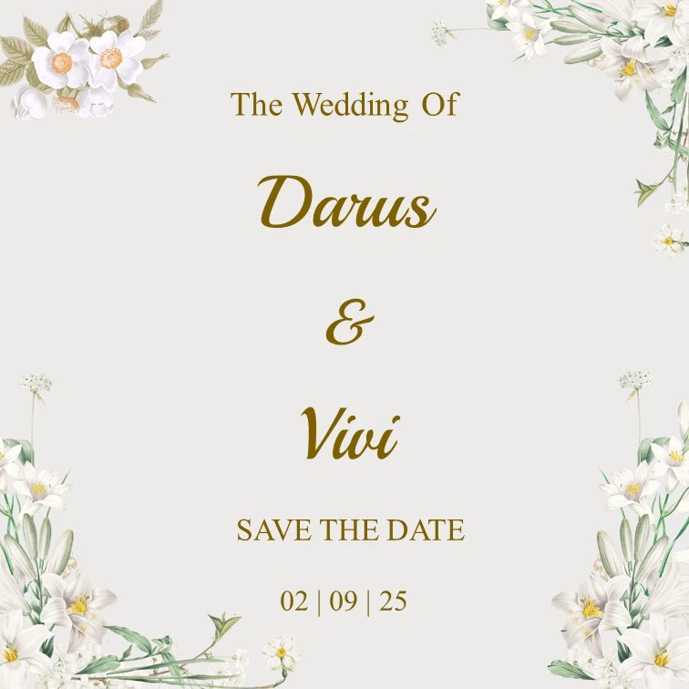 Save The Date Darus & Vivi kepada Buka Undangan Darus & Vivi Simpan di Kalender Assalamu’alaikum wr. wb. Segala Puji Bagi Allah SWT yang telah menjadikan hambanya hidup berpasang-pasangan. Dengan memohon Ridho, Rahmat, dan Berkah Allah SWT, kami bermaksud untuk mengundang Saudara/i dalam acara pernikahan yang kami selenggarakan. Count Down Hari Jam Menit Detik MENIKAH […]