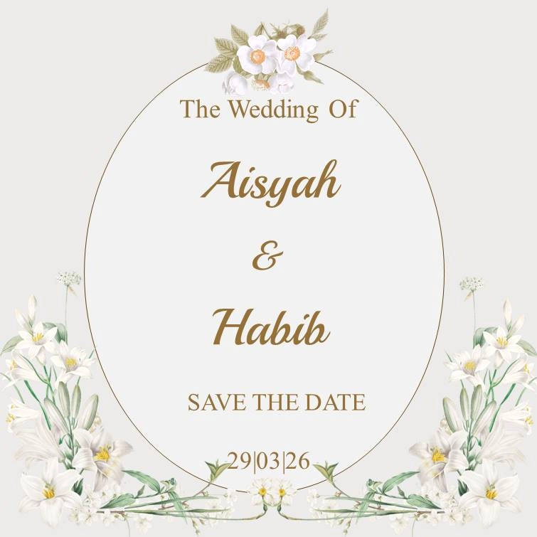 Save The Date Aisyah & Habib kepada Buka Undangan Aisyah & Habib Simpan di Kalender Assalamu’alaikum wr. wb. Segala Puji Bagi Allah SWT yang telah menjadikan hambanya hidup berpasang-pasangan. Dengan memohon Ridho, Rahmat, dan Berkah Allah SWT, kami bermaksud untuk mengundang Saudara/i dalam acara pernikahan yang kami selenggarakan. Count Down Hari Jam Menit Detik MENIKAH […]
