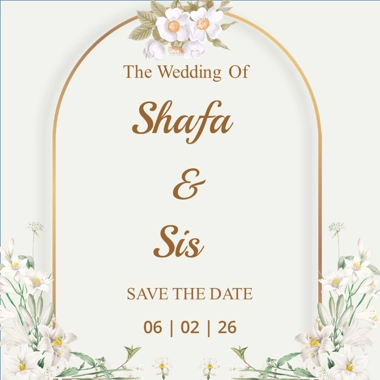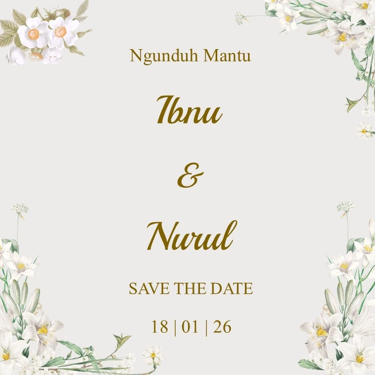 The Wedding Of Rifqi & Nisa 17.01.2026 “Dan segala sesuatu Kami ciptakan berpasang-pasangan agar kamu mengingat (kebesaran Allah).” QS. Az-Zariyat: 49 Save The Date 00Hari 00Jam 00Menit 00Detik Save The Date Two Become One Assalamu’alaikum Wr. Wb. Dengan memohon Rahmat dan Ridho Allah SWT, kami bermaksud untuk mengundang Bapak/Ibu, Saudara/i untuk menghadiri acara pernikahan kami. […]